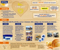 | Description | If you are really in love with the sun, you can be sure that with NIVEA Sun your feelings are ditto. Every your meeting will be full of joy, pleasure from getting beautiful bronze, care of you, your beloved and your children. NIVEA Sun protects you only from harmful rays. That’s why your meeting with the sun will be pleasure and full of positive emotions. Nivea SUN 360 BTL-activities across 4 channels with a unique web site linking all channels: Internet, Beaches, Points of sale, Schools. |