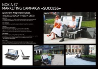 | Description | Nokia E7 Рекламная кампания «Успех» «Успеху не нужен офис» Цель: Познакомить широкую аудиторию с Nokia E7 и представить его как стильный смартфон для успешных людей. Объединить понятие «успех» со смартфоном Nokia E7. Идея кампании: У каждого из нас свое определение успеха. Задача: Привлечь внимание как можно большего числа успешных людей к телефону Nokia E7. Идея: Успеху не нужен офис! Пользоваться полным пакетом программ Microsoft Office, планировать свой день в органайзере, мониторить котировки и выполнять множество других офисных функций, вы теперь можете где угодно, вместе с новым Nokia E7. А работать на свежем воздухе – куда приятнее, чем в офисе. Решение: Мы создали лавочки в форме открытого Nokia E7, оборудовали их Wi-Fi и разместили внутри или около бизнес-центров в Москве и Санкт-Петербурге. На «скриншоте» было напечатано наше сообщение «Успеху не нужен офис» и предложение присесть и поработать прямо здесь, воспользовавшись бесплатным Wi-Fi (в радиусе 10 метров). Результаты: Более 1500000 контактов за один месяц в Москве (10 скамеек) и 670000 в Санкт-Петербурге (8 скамеек). |