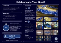 | Description | Objective It’s a good New Year tradition with Volkswagen to make original presents to its VIP-clients and partners. At the end of 2011 the agency was asked to come up with creative ideas. Thinking 1. Like many other successful people, Volkswagen VIP-clients and partners like attention 2. Good presents are unique Idea With Volkswagen, a common national holiday becomes more personal. Volkswagen brings celebration to YOUR street! Slogan Celebration in your Street! Execution Stage 1 Personalized street signs were presented to Volkswagen clients\partners\friends - we made more than 240 street signs with surnames and packed them into branded present boxes. Local clients got their presents personally and foreign friends and partners by post. Stage 2 On New Year’s Eve the country’s main news portal published news of the day: Volkswagen presents personal streets! During 24 hours about 44 000 Internet-users got personalized streets via flash-card. Results This New Year the world got 44 240 new streets! Video-case: www.youtube.com/watch?v=-akic0XmKOA |