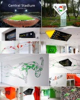 | Описание | Центральный стадион — спортивный объект федерального уровня в Екатеринбурге, потенциальная площадка для приема Чемпионата мира по футболу 2018 года. Задача: Разработать общую идею, объединяющую пространство Центрального стадиона, создать удобную рабочую систему навигации, рассчитанную на массовые события. Оформление должно гармонично сочетаться с исторически значимыми элементами здания — фасадами и внутренней отделкой. Идея: Стремление к совершенству это — достижение новых высот и движение к лучшему. Достижения и стремления — не что иное, как чистая энергия, которая послужила основой идеи оформления. Развитие энергии выражено в полигональной графике и направлено к центру стадиона. Основными визуальными образами стали спортсмены — футболисты и легкоатлеты — образы из будущего, прочный каркас, который позволяет спортсмену развиваться и двигаться вперед, к новым победам. |